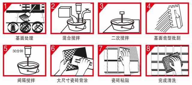 如果是全瓷砖、玻化砖、石材等低吸水率瓷砖建议还要在瓷砖背面涂上背胶。