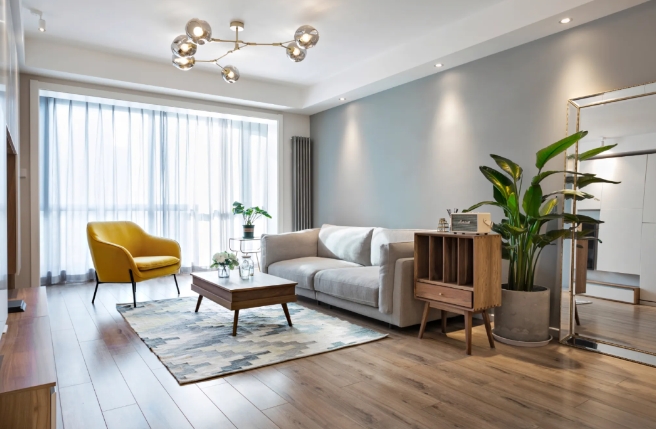 4、客厅与阳台不要做推拉门分隔,会显得客厅空间小,将两个空间打通,并将地砖通铺过去,更显宽敞大气。