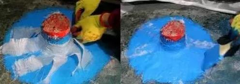 第五步,管根抹弧:喷水润湿,并采用朗凯奇堵漏王进行抹弧处理,防止因涂料堆积出现开裂。