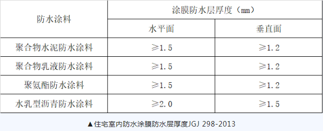 50345-2012中,明确了室内防水的防水层厚度(涂膜型),墙面涂膜厚度应≥1.2mm,地面涂膜厚度应≥1.5mm。