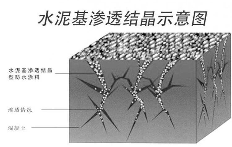 水泥基渗透结晶防水材料的工作原理是以水为载体,通过表层水对结构内部的侵蚀,被带入了结构内部孔缝中,并在结构孔缝中吸水膨大,由疏至密,有效降低了混凝土的孔隙率,特别是毛细管孔隙率,逐渐形成了一个个抗渗区域,大大提高了结构整体的抗渗能力,从而保护混凝土少受侵蚀,提高了混凝土的耐久性。