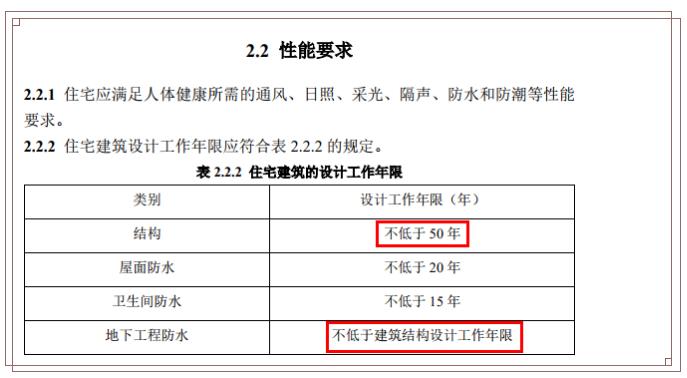 结构不低于50年,屋面防水不低于20年,卫生间防水不低于15年,地下工程防水不低于结构设计工作年限(即50年)。