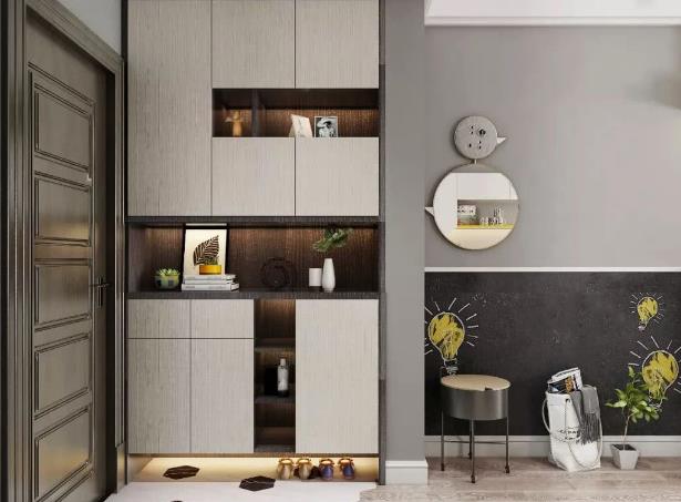 在玄关处规划一个靠墙定制玄关柜,可以根据实际需要将玄关柜自上而下分为三段式或五段式。