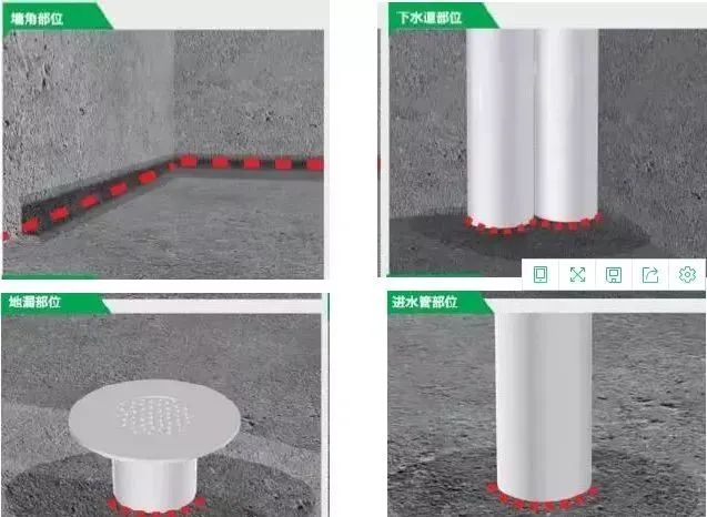 管根部位、地漏、阴角等细部节点与建筑基面不是一个整体,连接处不可避免的存在缝隙,且这些部位是建筑物应力比较集中的部位,存在渗漏水隐患。防水施工时,使用堵漏王对地漏、管根周边、阴角等细部节点抹弧做增强处理,可提高防水使用寿命,降低渗漏隐患。