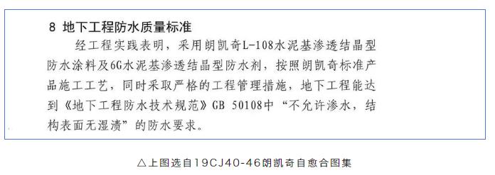 2、在结构混凝土的迎水面或背水面涂抹朗凯奇L-108水泥基渗透结晶型防水涂料,厚度不小于1.0mm,用量不小于1.5kg/m²。