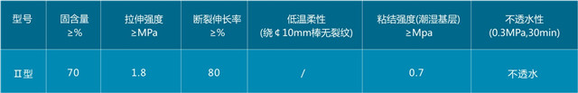 2. 涂膜强度高,延伸率大,对基层收缩和变形开裂适应性强。