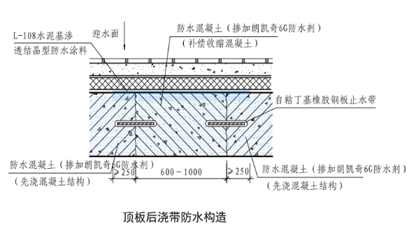 5、后浇带迎水面防水措施采用朗凯奇L-108水泥基渗透结晶型防水涂料,宽度应为后浇带宽+250mmx2,厚度≥1mm,用量≥1.5kg/m²。