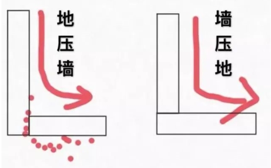 普通的地压墙工艺,会导致墙角缝隙长期积水,从而产生异味及发霉,防水性能差。墙压地相比传统的地压墙,虽然对工艺的要求高,但可以让卫生间产生的水渍完全排入地漏,不会积累在墙角缝隙处。