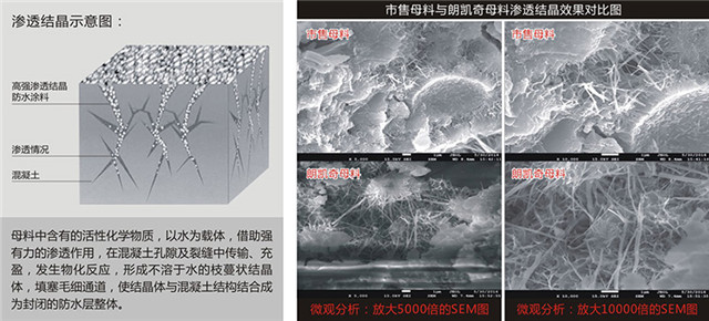 ◆ 通过对比市售母料和朗凯奇母料在不同放大倍数下的扫描电镜图可以看出,朗凯奇母料结晶效果明显优于市售母料,这些枝蔓状的结晶体主要存在于缝隙中,堵塞毛细通道,并与基体连接成一个整体,从而起到防水效果。