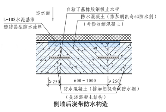 1、先后浇筑的混凝土采用掺加朗凯奇6G水泥基渗透结晶型防水剂的防水混凝土,用量应为单方水泥混凝土中水泥重量的0.8%~1.5%,混凝土结构中的钢筋应连接。